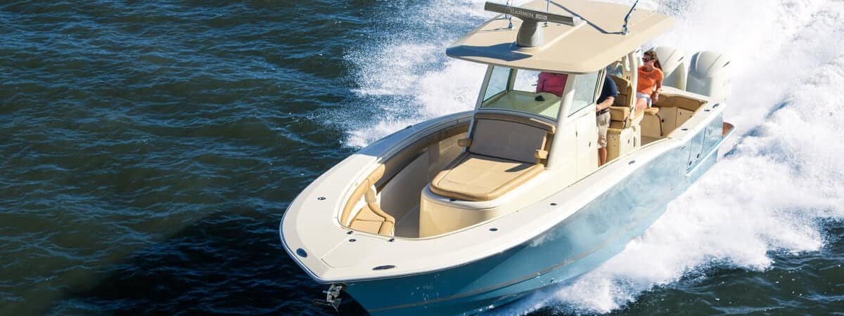 This dual-console boat can help you glide from one fishing destination to another. To help you catch your fill of mackerel, it has a large cockpit fishing area, a 25-gallon baitwell, and flush-mounted rod holders for four rods. It also has port and starboard fish boxes for enhanced convenience.
